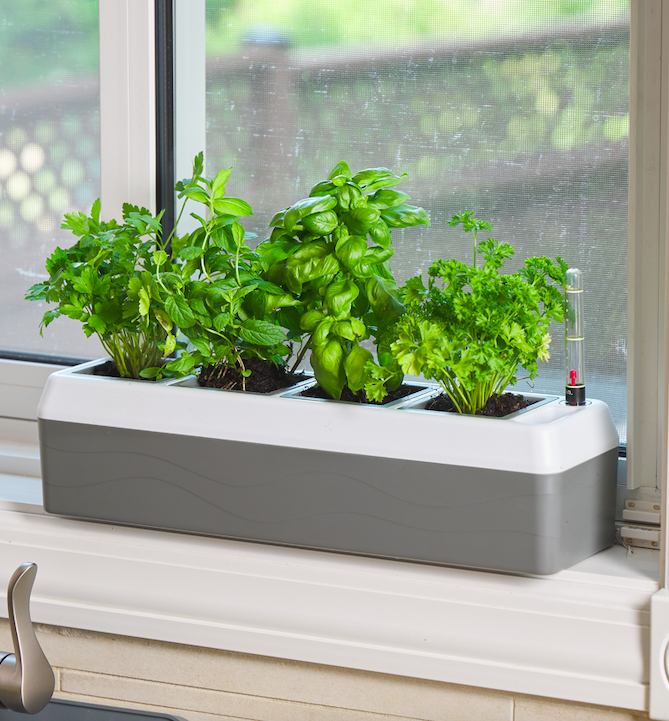 Window Sill Planter: This is a neat way to keep four “pots” of herbs that I use regularly at hand in the kitchen. Simply fill the reservoir with water, and it supplies it to the plants on an as-needed basis. And it looks sleek and tidy on the counter!