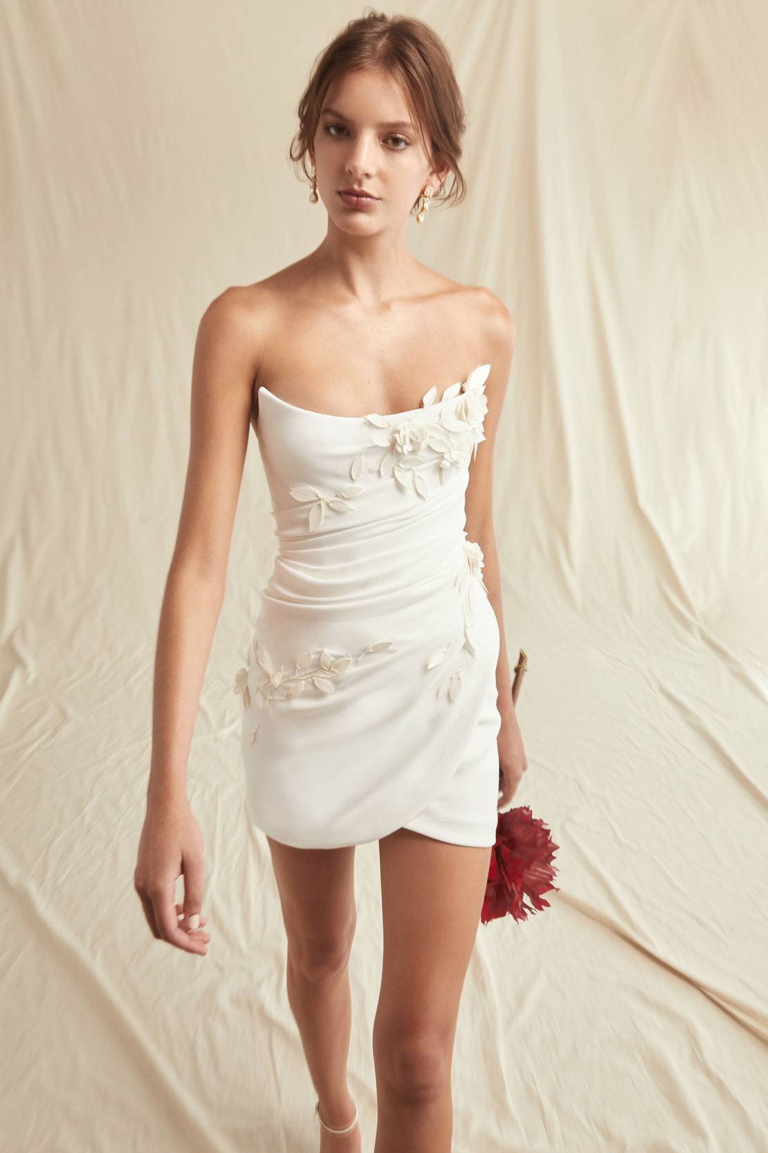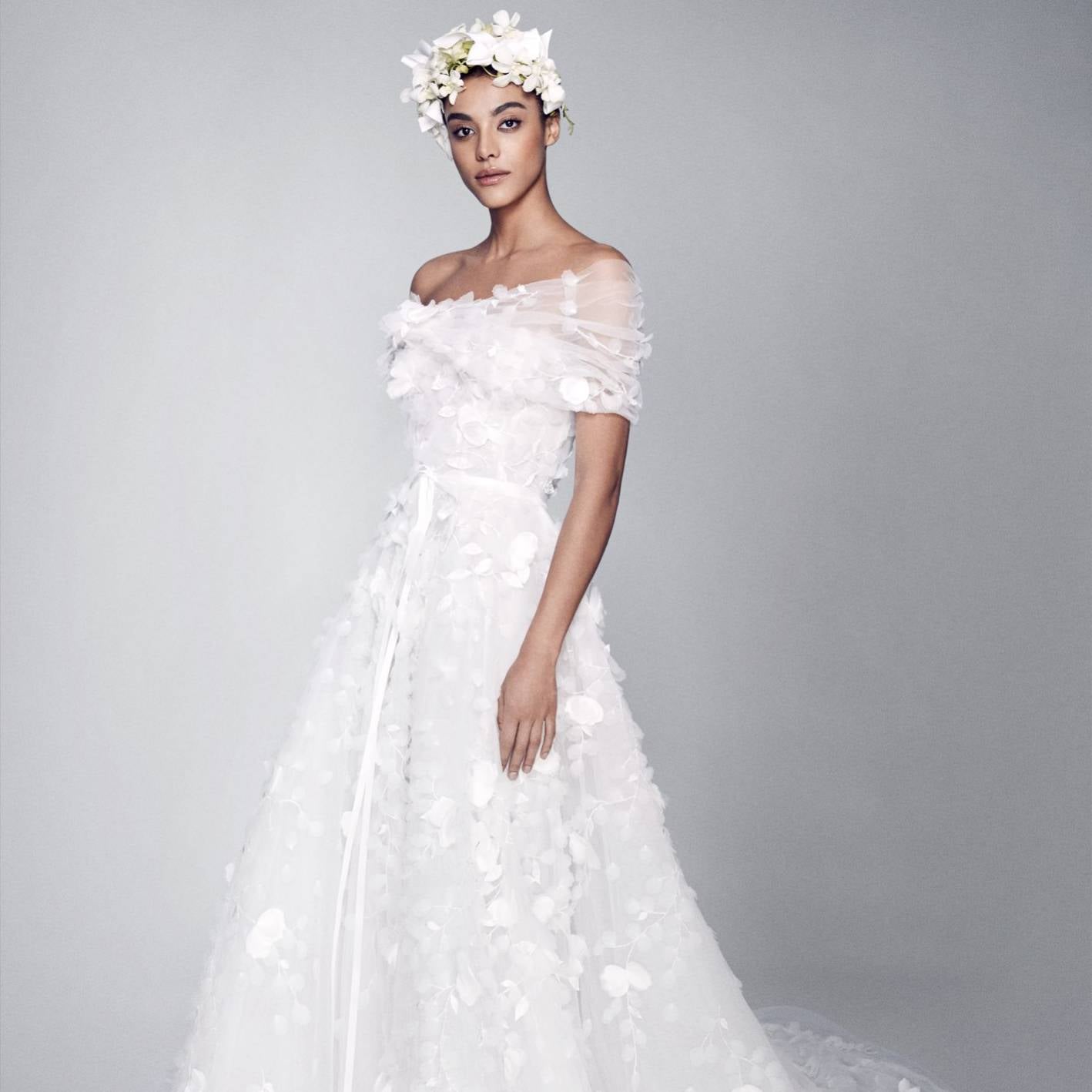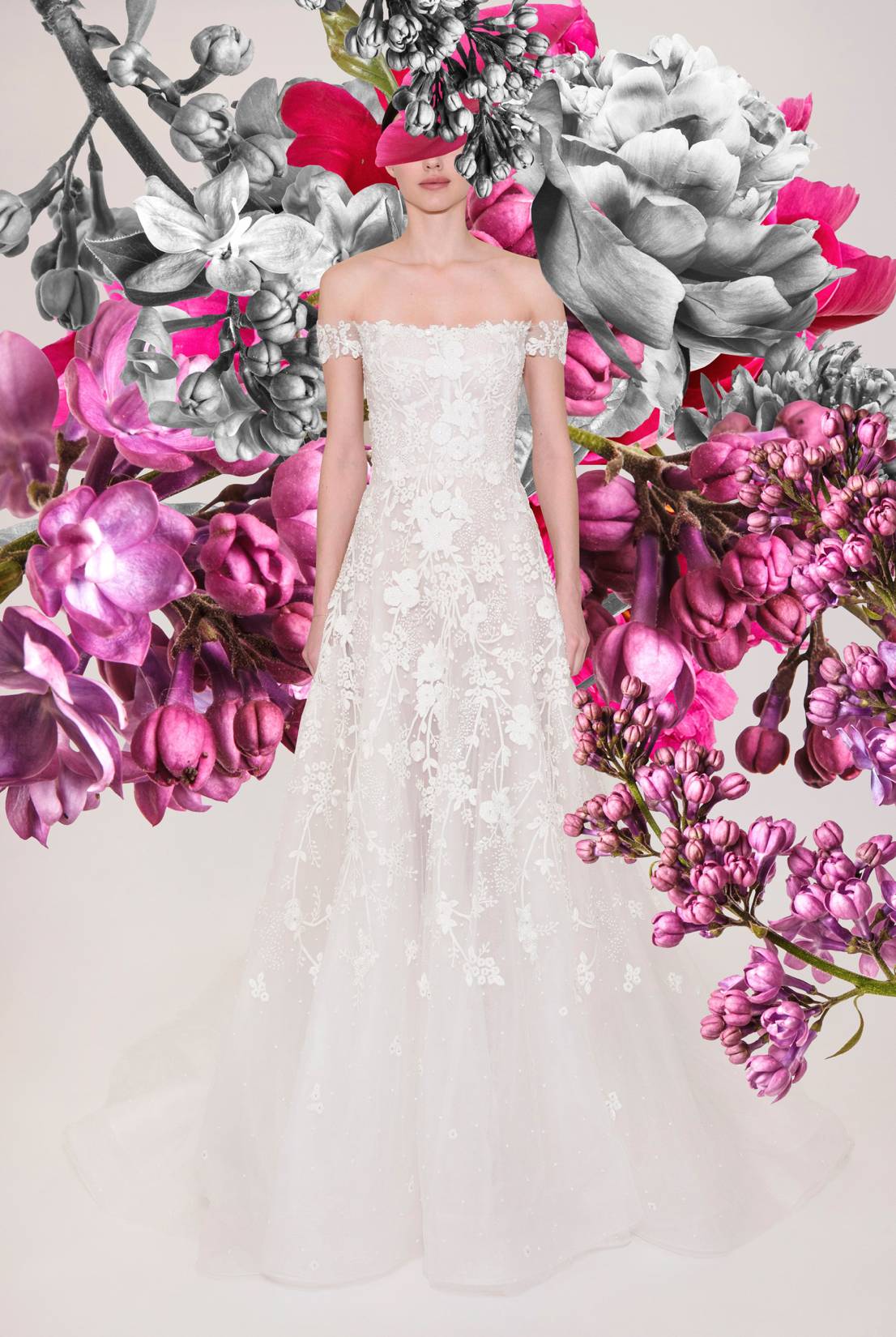 - Reem Acra decided to shoot her Spring 2022 bridal lookbook against this bright floral background, which allows the dresses from her collection to standout amongst themselves