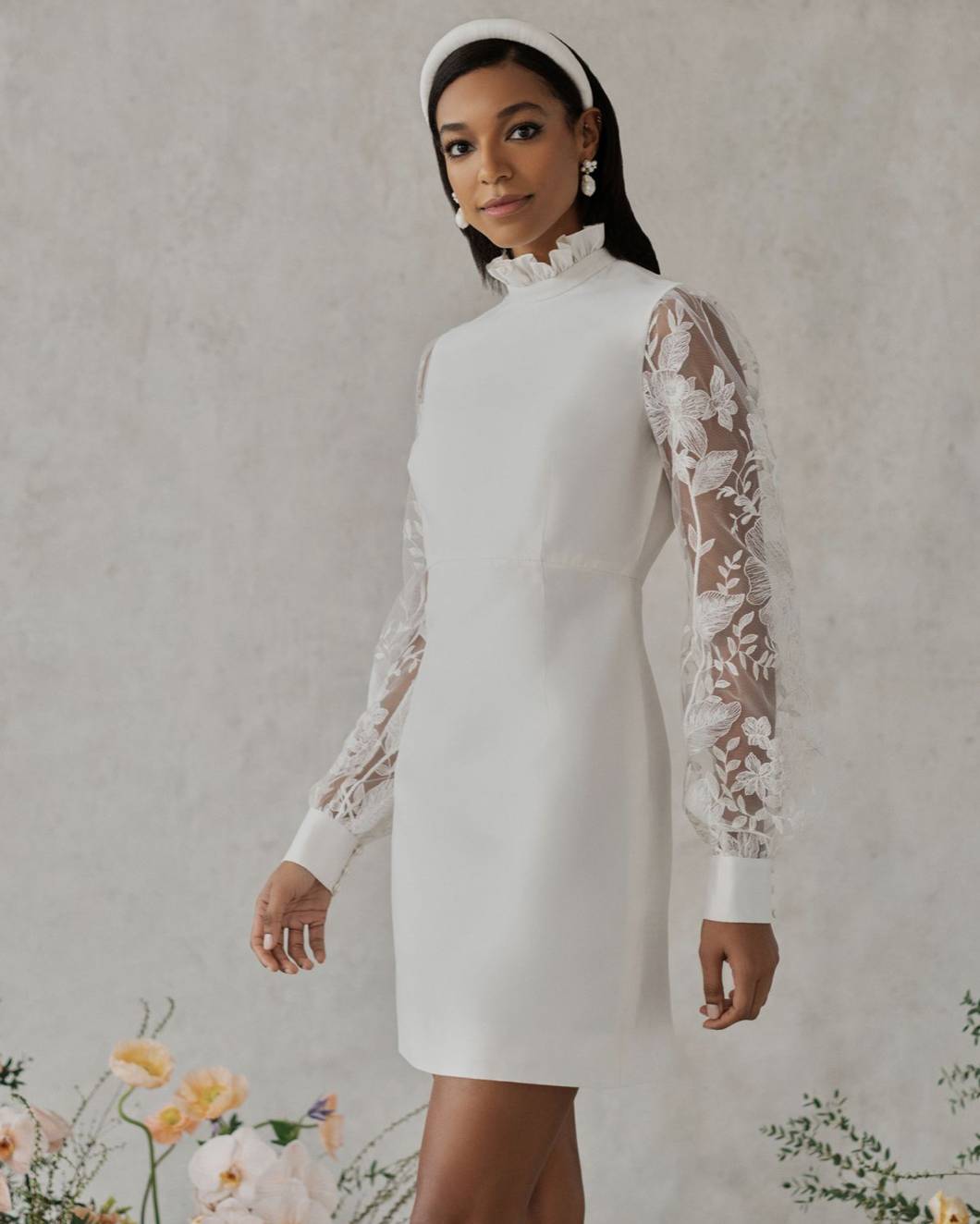 - Alexandra Grecco’s darling short hem, high neck, and sheer capped sleeves modernize 60s bridal for vintage lovers in 2021
