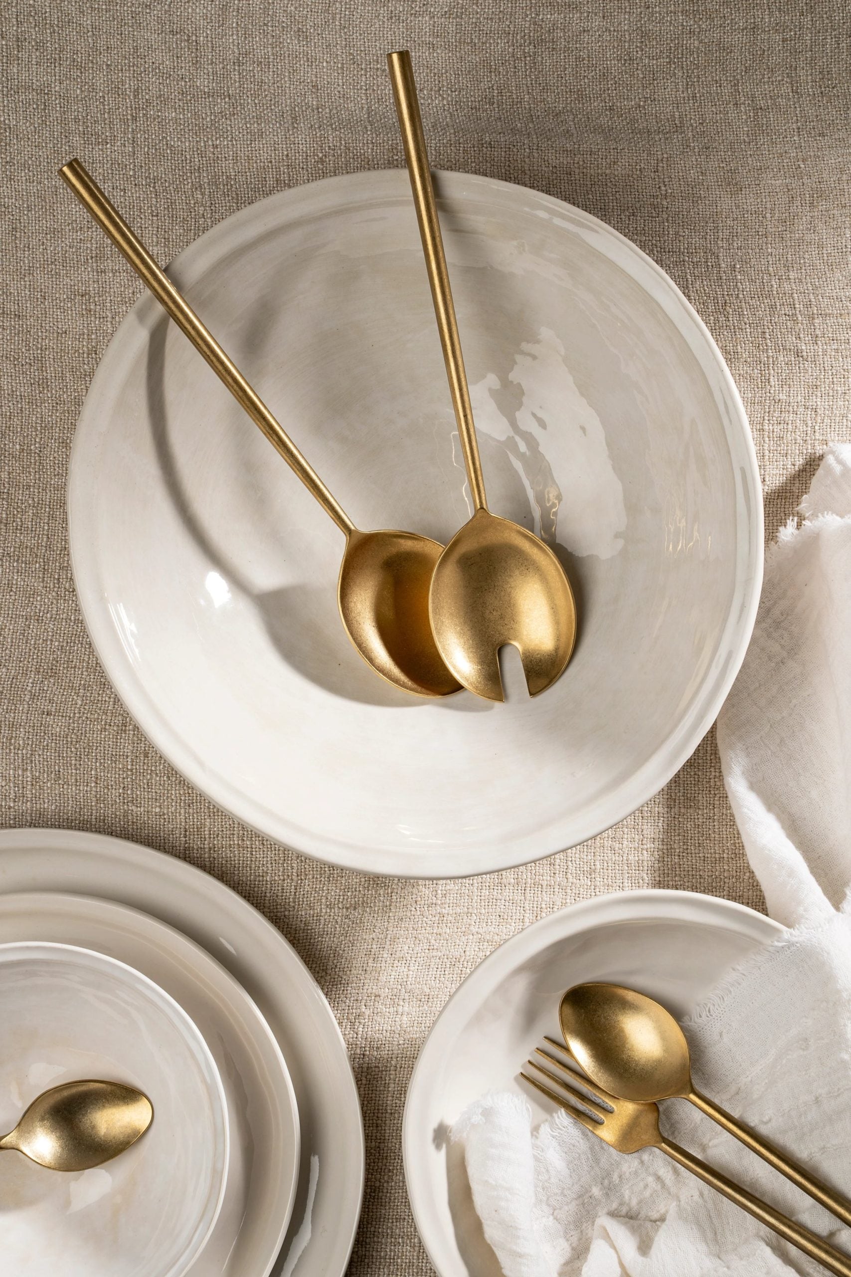 Hand-forged in Moradabad, India, a city celebrated for its metal craftsmanship, the Tides Salad Servers reflect timeless quality and artisanal skill. Crafted from stainless steel, each piece features a distinctive distressed matte gold finish, proudly showcasing the authentic marks of its maker. Designed to elevate family-style pastas and salads, these servers bring enduring elegance to the table.