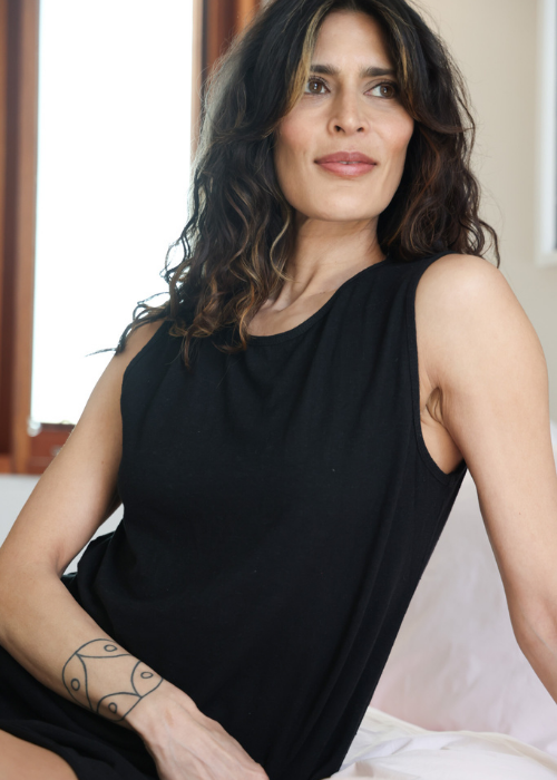 The second thing I looked at was the style. Our sleepwear solves a problem — sleeping with night sweats. If we want to do that well, we have to consider where the sweatiest parts of our body are. During a night sweat, our glands open under the arms, at the chest, and around the torso – those are the areas where night sweats tend to hit hardest and first, so the neck area is a subtle scoop because the fabric can wick the sweat better around the chest. I chose sleeveless because the heat that is given off during a night sweat can be significant, so sleeves can be too confining for some people, and finally, the nightgown is knee-length because my own experience led me to have burning legs during a hot flash, so I wanted the flexibility of being able to hike the nightgown or pull it down below the thighs when necessary.