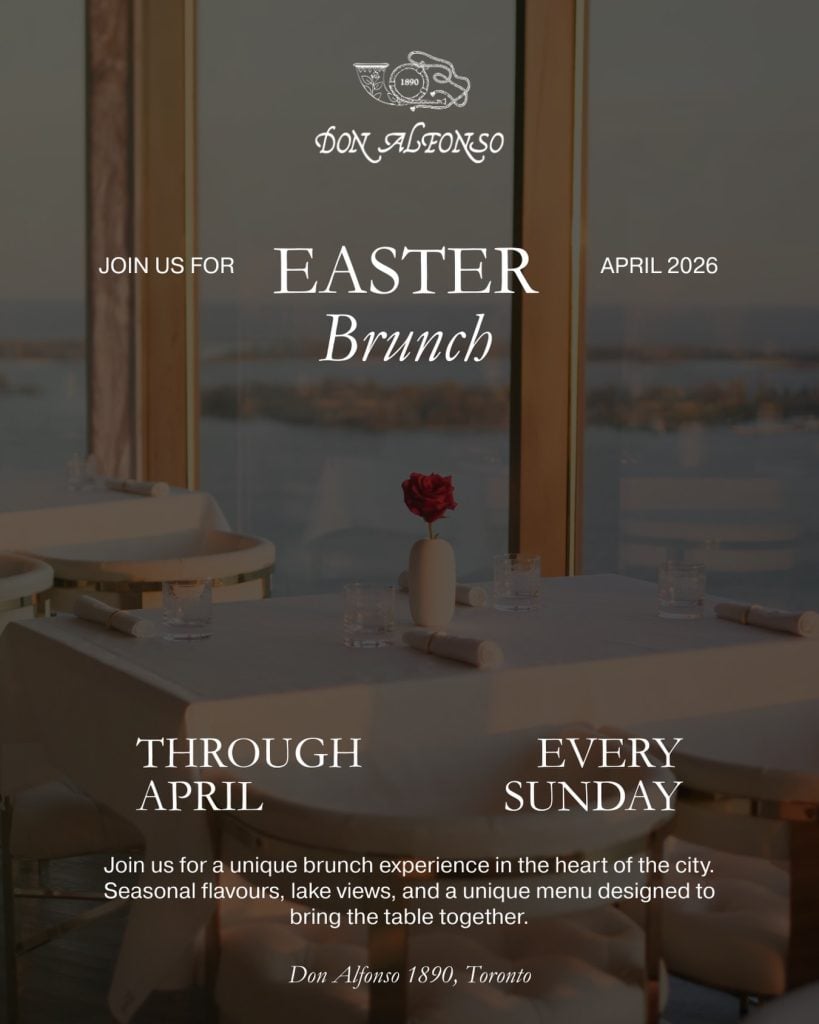 Don Alfonso 1890 Toronto invites guests to experience its culinary artistry in a new light. Starting Easter Sunday, April 5, and every Sunday through April, enjoy a limited-time brunch by Executive Chef Davide Ciavattella. Traditionally an evening-only destination, brunch offers signature skyline views and a set menu of seasonal, beautifully plated Italian dishes—Michelin-starred quality for $100 per person.
